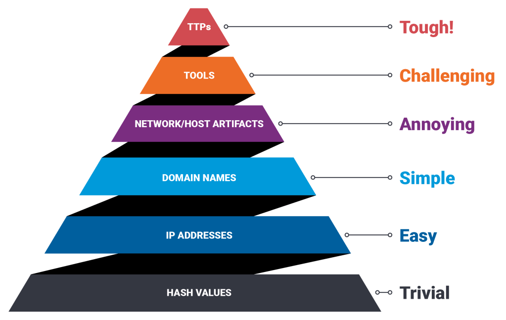 The various kinds of indicators of compromise (IOCs) are displayed in the pyramid of pain. Attackers find it extremely difficult to alter the components at the top of the pyramid, such as tools and TTPs (tactics, techniques, and procedures). While responding to IOCs at the bottom of the pyramid is only a hassle for online attackers, responding to those at the top of the pyramid makes life for hackers pretty miserable. A sizable portion of the pyramid can be covered by machine learning. Up to the TTPs, which can be understood and intelligently addressed in real-time by cyber AI technologies, AI technology can be used to identify indicators across this pyramid.