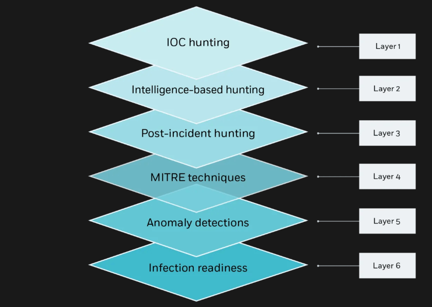 - Infection readiness: As no threat hunting process is airtight, this layer is about hardening response, deploying deception, and preparing response for attack.